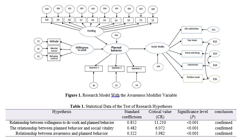Results. The results showed that there was a significant positive relationship between willingness to do work and planned behavior of participation in sports activities, planned behavior of participation in sports activities and social vitality (P≤0.05).
