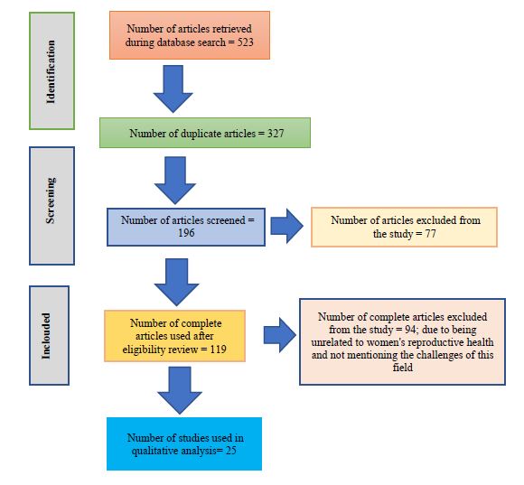 This study used a scoping review method to identify challenges related to women's reproductive health. A scoping review is a type of secondary study that synthesizes research evidence from primary research studies. It aimed to identify the nature, characteristics, volume, and scope of the research literature, categorize them, and identify knowledge gaps in the existing literature. This type of review is suitable for answering "what" and "why" questions within a specific subject area. The scoping review followed the Arksey & O’Malley protocol, which includes six stages: identifying the research questions, identifying relevant studies using reputable databases, reviewing texts, theses, review articles, and study references in the research area, selecting relevant studies for review from primary studies, charting the data in diagrams and tables, collecting, summarizing, and reporting the findings, and optionally consulting experts about the findings. This study utilized electronic English databases such as Scopus, PubMed, and Web of Science, and Persian databases including Magiran and SID, as well as search engine Google Scholar. The keywords used in this search included Reproductive Health, Women's Health, Sexual and Reproductive Health, Reproductive Health Policy, Reproductive Health Challenges, and Reproductive Health Services. Additionally, manual searches of references, lists of obtained articles, and grey literature in the field of reproductive health were conducted. The retrieved studies were imported into EndNote software. Inclusion criteria based on time (between 2015 and 2023) and language (Persian and English) were applied. Overall, 523 articles were retrieved from the database searches after removing duplicates and articles lacking full texts. In the final step, 12 articles were excluded due to incomplete data, resulting in 25 articles selected for final review (Chart 1).