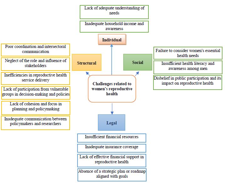 This study emphasizes the importance of women's health and aims to improve health levels within this group. It identifies several challenges in women's reproductive health across various studies. These challenges include the neglect or lack of understanding of women's essential needs, insufficient household income and awareness, inability to make informed decisions regarding reproductive health, lack of stakeholder participation in policymaking and decision-making, unequal distribution of human resources and facilities, inadequate financial resources, poor insurance coverage, prevailing cultural and social structures, and the absence of strategic programs aligned with objectives. These issues often prevent women from accessing adequate reproductive health services and improving their health levels. Therefore, it is essential to focus on the following:
